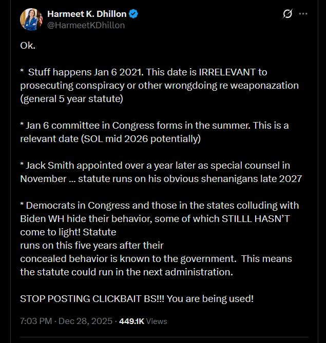 No statute of limitations will hinder DOJ's efforts to bring justice to those who weaponized persecution of American citizens. January 6th 2026 is NOT a deadline for DOJ to bring prosecutions.